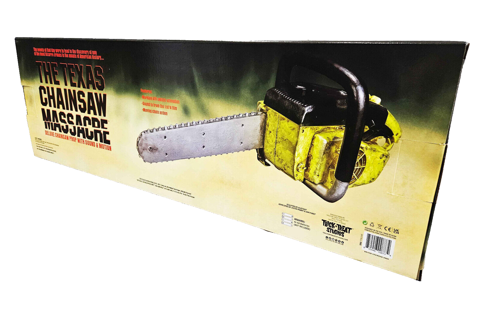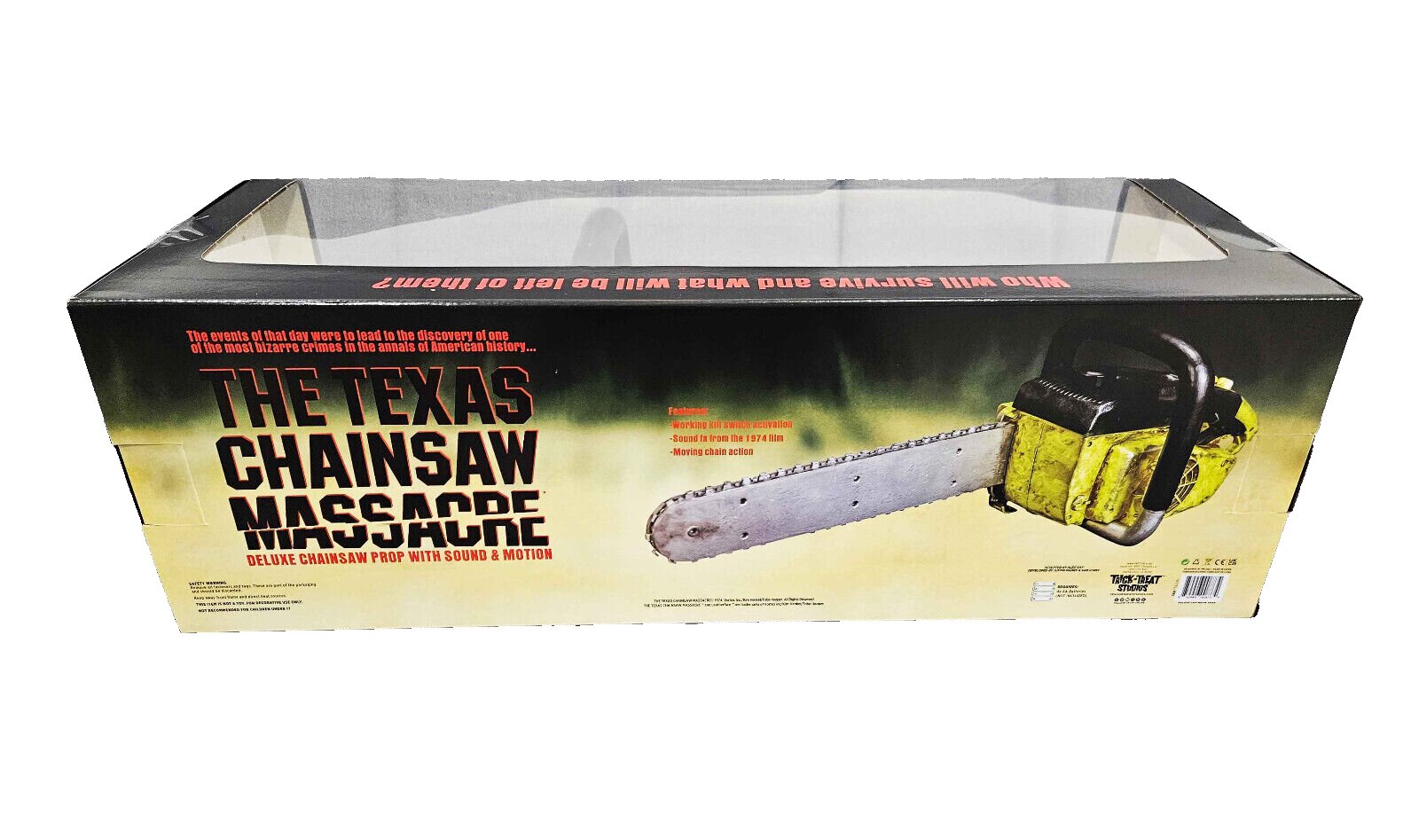 Ein Kippschalter aktiviert die Requisite, die einen konstanten Motor-Leerlauf-Sound-Effekt hat, wenn sie eingeschaltet ist. Drück den Abzug, um die Kette zu drehen und die Kettensägen-Soundeffekte direkt aus dem Film zu entfesseln!