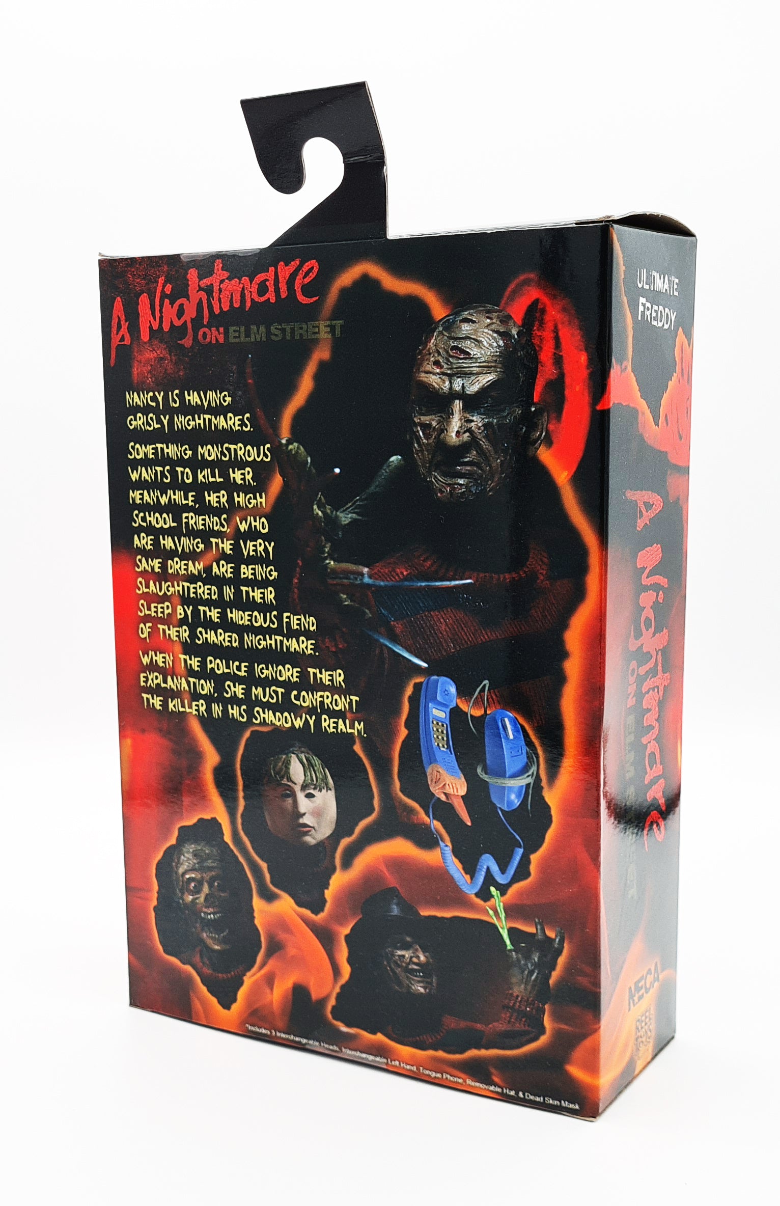 Freddy ist knapp 18cm groß und verfügt über einen brandneuen, voll beweglichen Unterkörper mit kugelgelagerten Oberschenkeln und Knien. Er enthält drei austauschbare Köpfe: einen mit geschlossenem Mund, eine Grimasse mit offenem Mund und ein Totenkopfgesicht. Er verfügt über eine austauschbare linke Hand mit zwei abgeschnittenen Fingern, eine Maske aus abgestorbener Haut, ein Zungentelefon und seinen treuen Fedora.