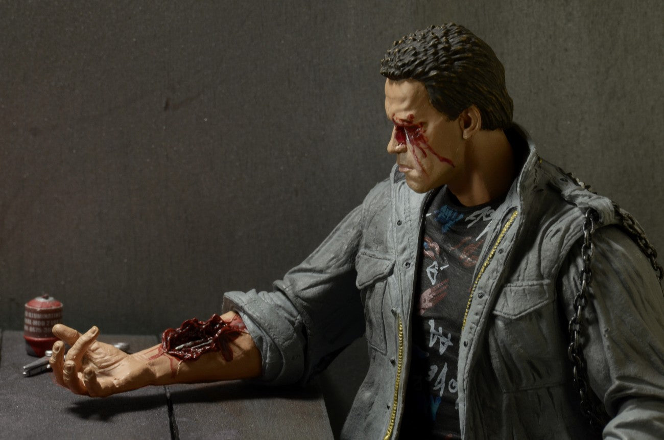 Der Ultimate Tech Noir T-800 trägt dieses Punk-Outfit mit Metalljacke und Kettenfolie und sieht Arnold Schwarzenegger ähnlich.
