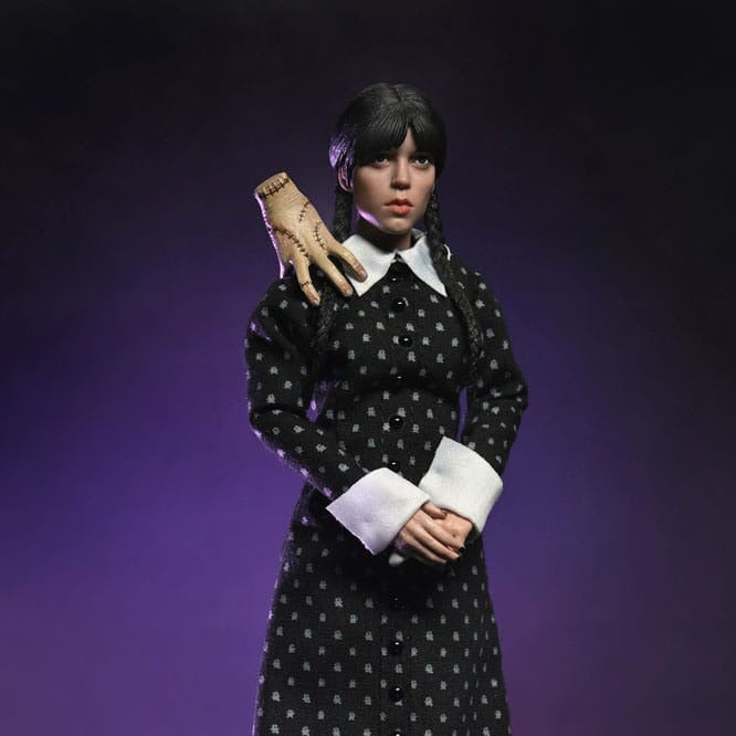 Die kluge, sarkastische und innerlich etwas tote Wednesday Addams wird von der Schule verwiesen und auf die Nevermore Academy versetzt, eine Privatschule für monströse Außenseiter. Während sie sich an ihre neue Umgebung gewöhnt, wird sie mit Kriminalfällen, Geheimgesellschaften, den lokalen Normalos und – am schlimmsten – grellen Farben konfrontiert. Diese voll bewegliche 20 cm große Figur trägt ihr klassisches Kleid und maßgeschneiderte, weiche Kleidung, die von Vintage-Spielzeugserien inspiriert ist. Zum Zubehör gehören austauschbare Hände, ein Frankenstein-Buch und ihr stets treuer, fühlender Begleiter: Thing!
