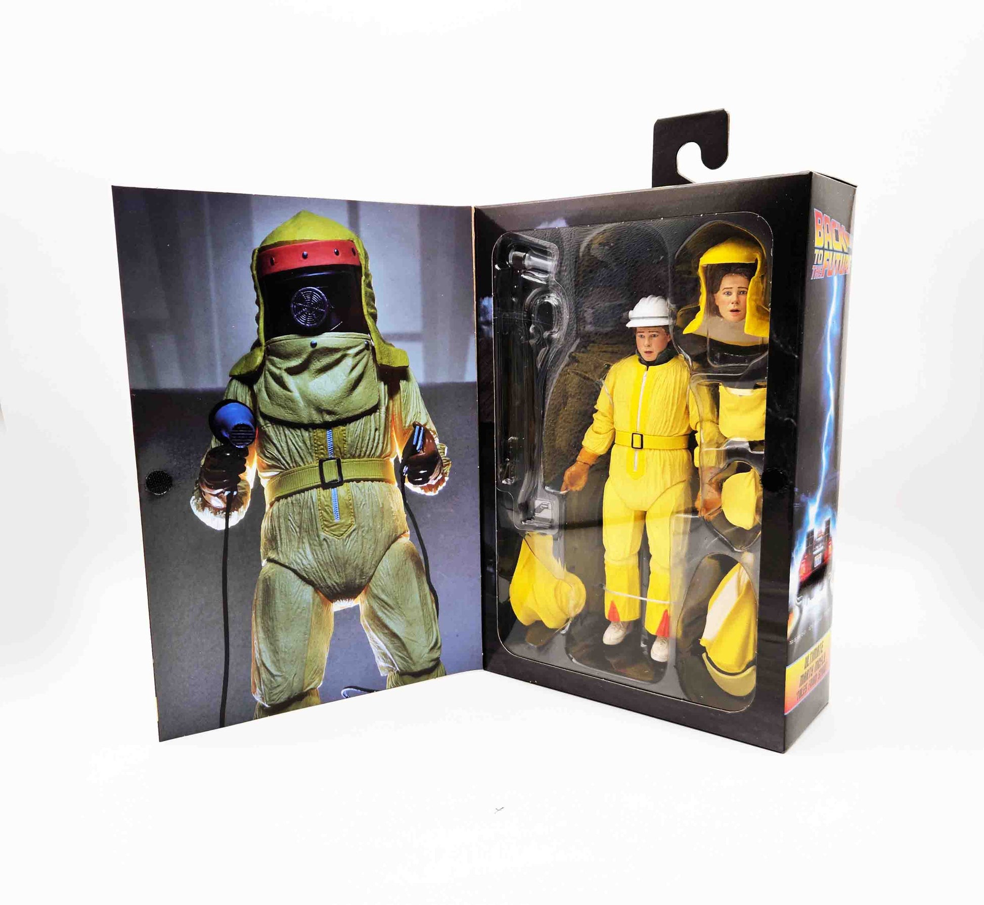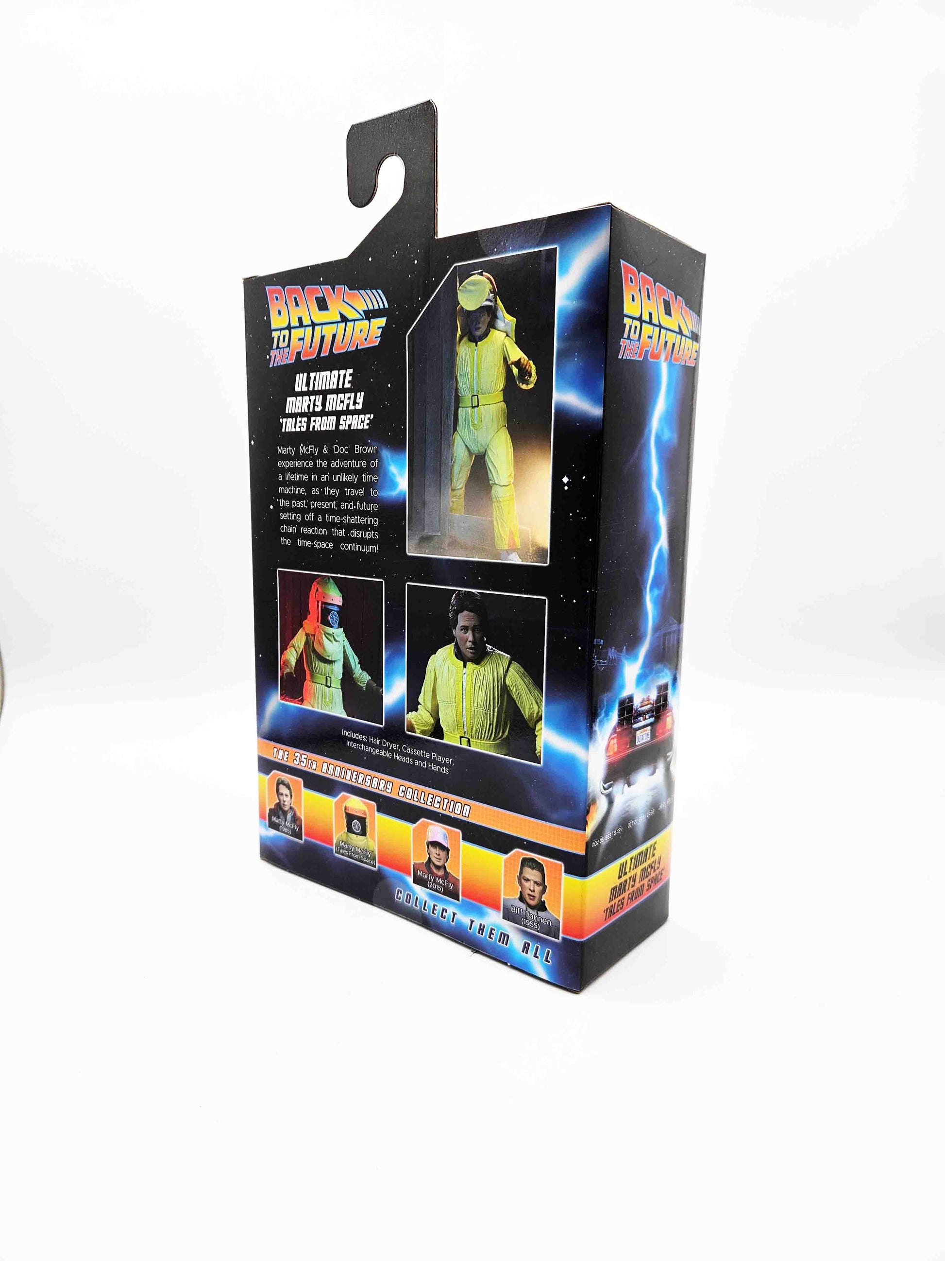 NECA freut sich, die Ultimate Tales From Space Marty McFly aus „Zurück in die Zukunft“ mit dem offiziell lizenzierten Konterfei von Michael J. Fox präsentieren zu können. Ausgestattet mit einem Haartrockner und einem Gehirnschmelzgerät, einem sogenannten Kassettenspieler, trägt Marty einen Schutzanzug mit austauschbaren Köpfen und Kapuzen, um sein Aussehen als Besucher vom Planeten Vulkan darzustellen.Verpackung in Fensterbox.